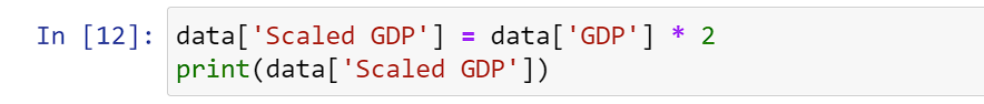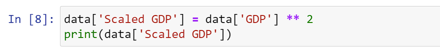Here we are assigning a new column ‘Scaled GDP’ to the squared value of the values of the column ‘GDP’ and printing the created column afterwards.