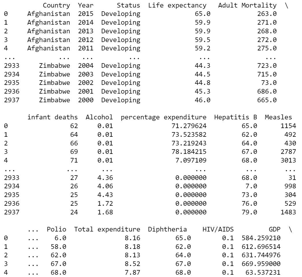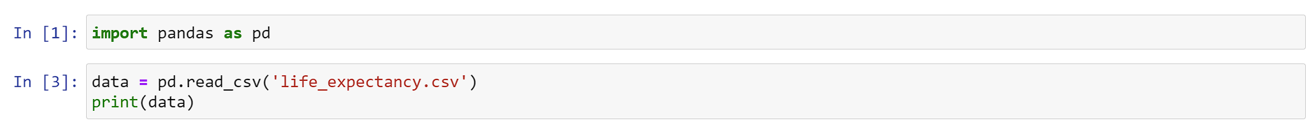 on the first line we are importing all the contents of the pandas library and giving it an alias ‘pd’ to make it easier to work with. Next we call the ‘read_csv’ function, this allows us to read the contents of the specified csv file in our case it’s ‘life_expectancy.csv’ and then we print out the contents of the stored dataframe.